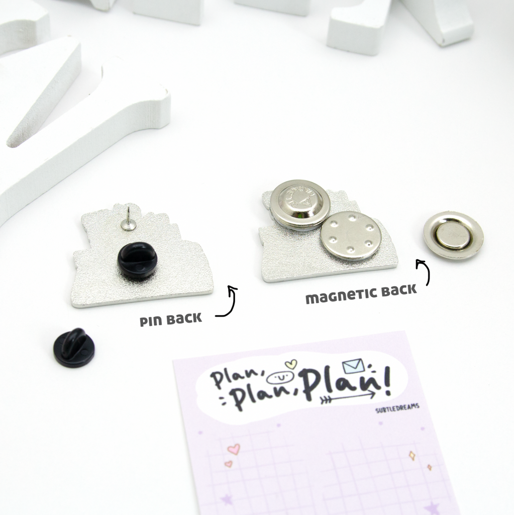 Pin Details: Magnetic and pin back attachment. Cannot be used as a fridge magnet. Comes with a backing card.